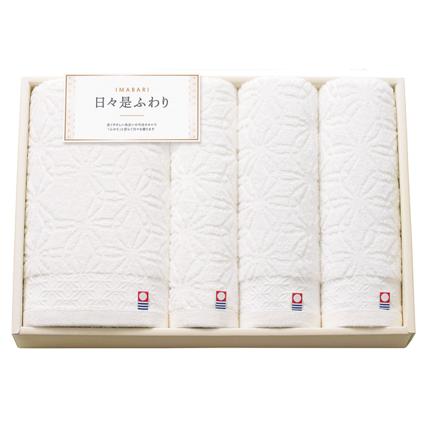 内容 バスタオル(60×110cm)、フェイスタオル(34×75cm)×2、ハンドタオル(34×30cm) 箱サイズ 26×38×5.5cm パッケージ 化粧箱 原産国 日本 お届けについて