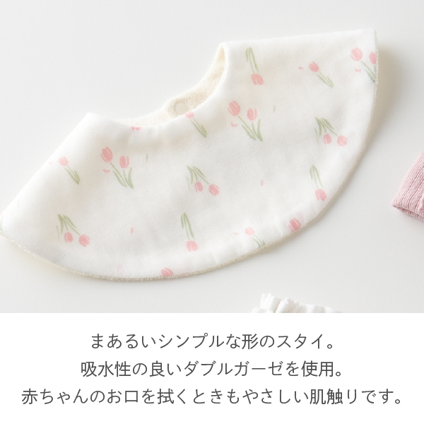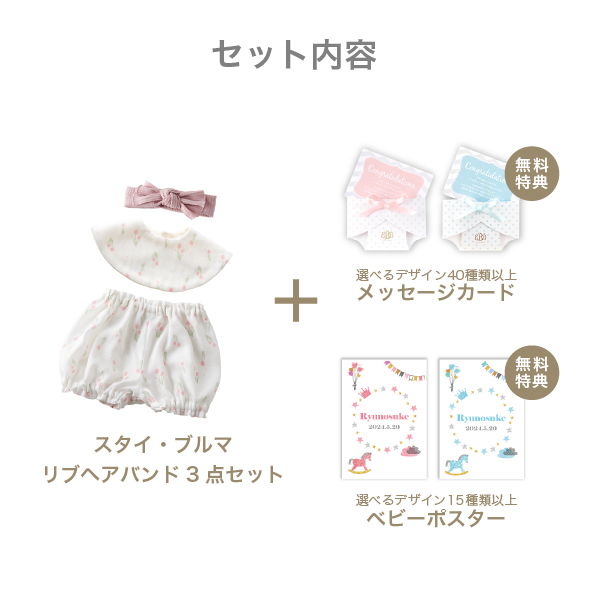 スタイ・ブルマ・ヘアバンドがセットになった、出産祝いにぴったりのギフト。チューリップのやさしい花柄が赤ちゃんの可愛らしさを引き立てます。