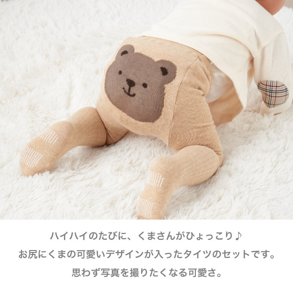 お尻にくまの可愛いデザインが入った、人気のベビータイツのセットです。