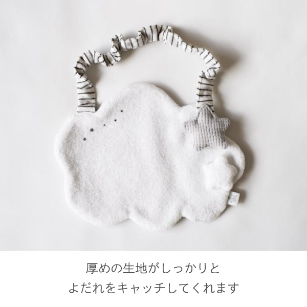 ふわふわ感が伝わってくる雲のデザインに、星のマスコットがついてオシャレ感をプラス♪厚みのあるデザインで、しっかりとよだれをキャッチし、大切な洋服を守ってくれます。シンプルなデザインは、どんな装いにも合わせやすいのも嬉しいポイントです。 -