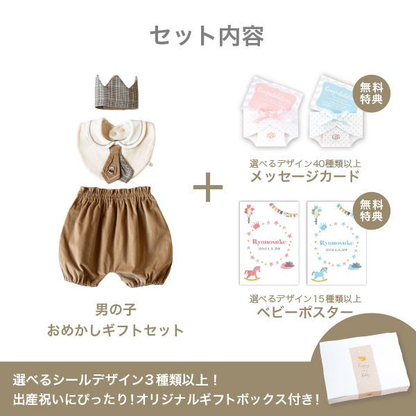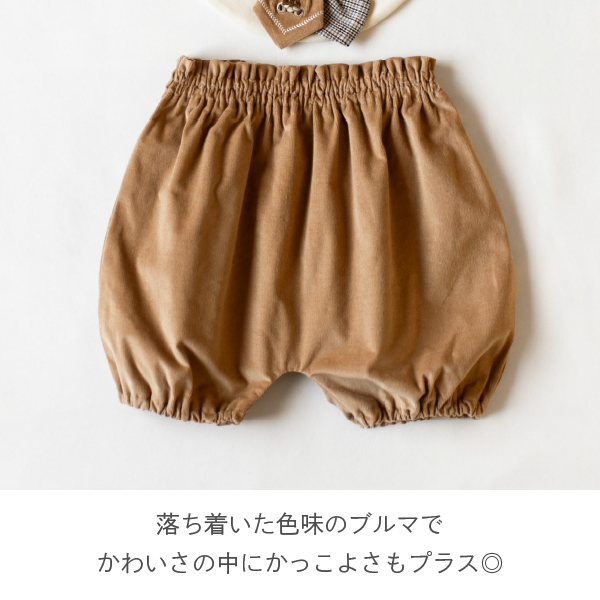 特別な日の装いにぴったりな、上品なロイヤルベージュカラーのギフトセット。ふんわりシルエットのブルマが、赤ちゃんを可愛らしく引き立てます。