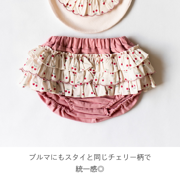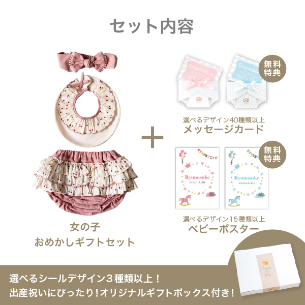 華やかなチェリーピンクカラーが魅力のギフトセット。可愛らしいヘアバンド、上品なスタイ、ふんわりシルエットのブルマが、赤ちゃんの特別な日を彩ります。