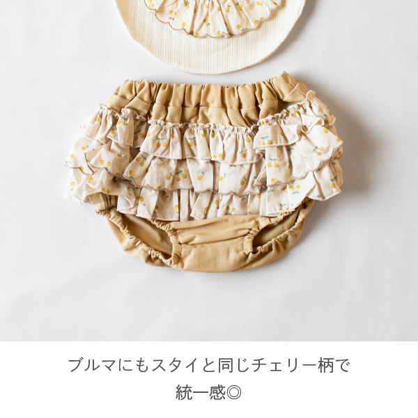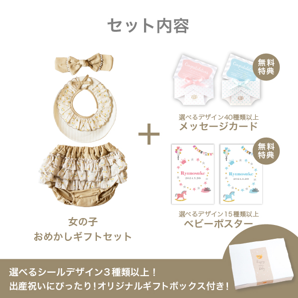 華やかなチェリーイエローが印象的なギフトセット。キュートなヘアバンド、上品なスタイ、ふんわりとしたブルマが、赤ちゃんの可愛らしさを引き立てます。