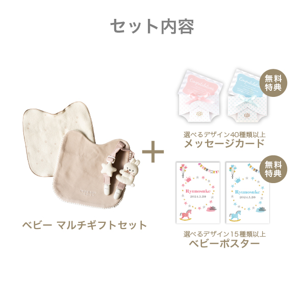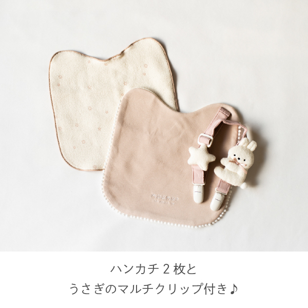 愛らしいくうさぎモチーフがポイントの、実用的なギフトセット。おしゃぶりやおもちゃの落下を防ぐマルチクリップと、やさしい肌触りのハンカチをセットにしました。