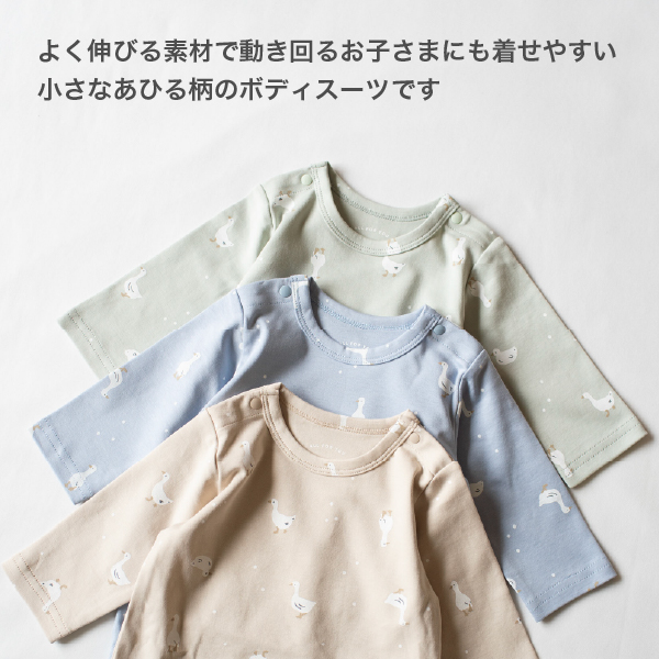 やさしいミントカラーが目を引く、ナチュラルでおしゃれなアヒル柄ボディスーツ。ほんのりくすみ感のある色味が今っぽく、着せるだけでトレンド感のあるコーデに仕上がります。