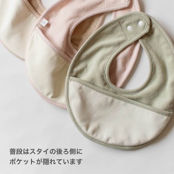 ポケット付きでよだれや食べこぼしをしっかりキャッチしてくれる、頼れるスタイ。赤ちゃんをやさしく守ってくれる存在で、まるでお守りのような安心感があります。