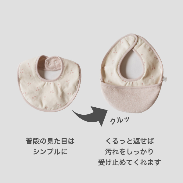 ナイロンが苦手な赤ちゃんにも使いやすく、食事エプロン代わりとしてもおすすめ。ふんわりピンクカラーで赤ちゃんの可愛さを引き立て、写真映えばっちり。