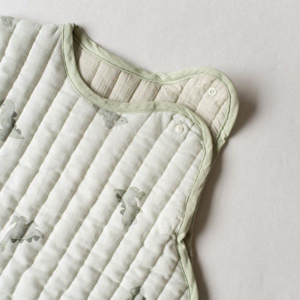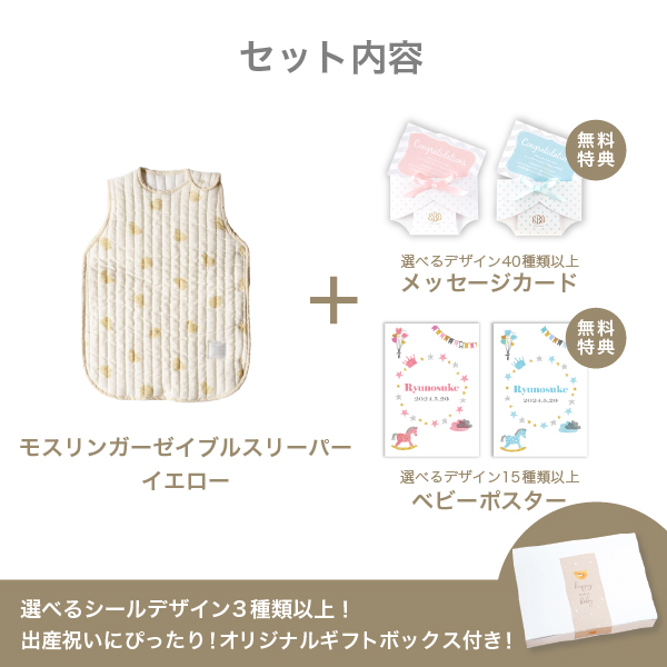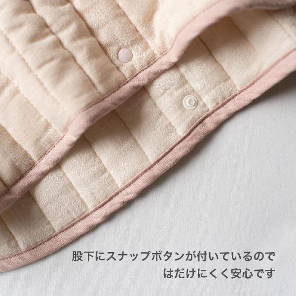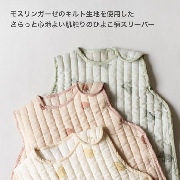やさしいイエローカラーが可愛らしい、モスリンガーゼ素材のイブルスリーパー。キルト生地ならではのふんわりとした触り心地で、赤ちゃんをやさしく包み込みます。