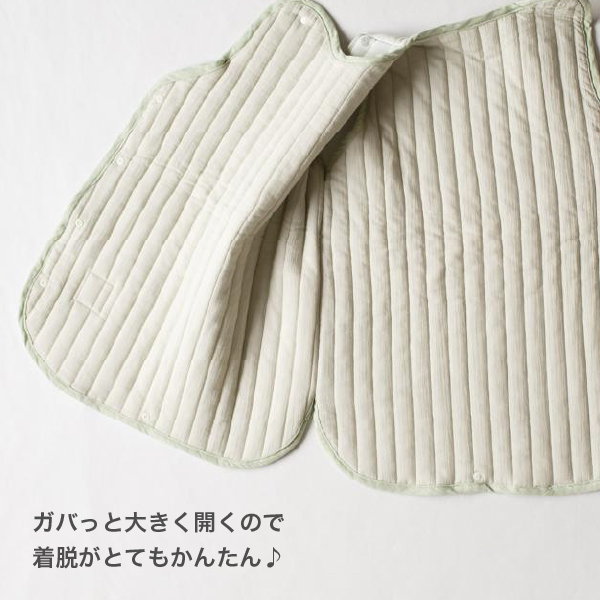 爽やかでやさしいミントカラーが目を引く、モスリンガーゼ素材のイブルスリーパー。キルト生地ならではのふんわり感と軽やかな着心地で、赤ちゃんをやさしく包み込みます