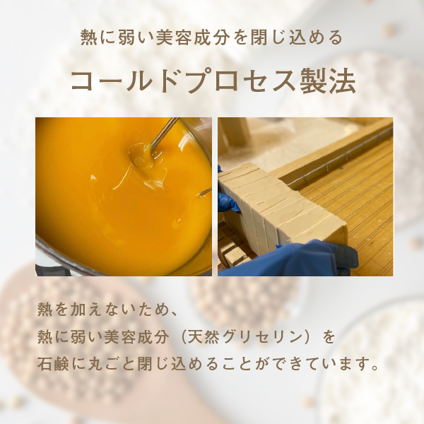 成分は天然成分「国産(鹿児島県産)大豆油」「水」「水酸化Na」のみ。添加物を一切使用していない【完全無添加石鹸】です。