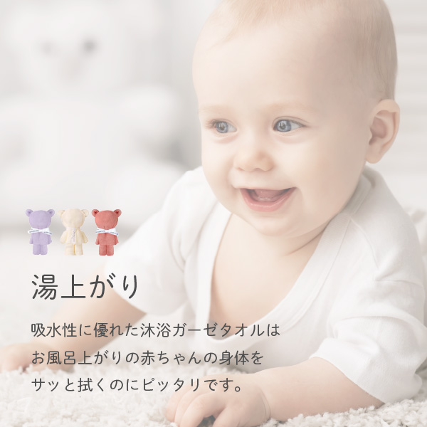 驚くほどの柔らかさと、保湿性、吸水性に優れた赤ちゃんのお肌を優しく洗うのにぴったりな沐浴ガーゼは育児の必須アイテム!1度の沐浴に使用するガーゼタオルは平均2?3枚程と言われており、何枚あっても喜ばれます。赤ちゃんはまだお湯に浸かることができないので、体が冷えてしまわないように沐浴ガーゼをかけたりして体温を調節したりします。デリケートなお肌を傷つけないように、沐浴専用のガーゼはとってもおすすめです。もちろん、お風呂だけではなく汗を拭いたり、よだれを拭いたりする時にもとっても便利。クマの形をしたタオルは使うのがもったいないくらいキュートで、ママのテンションもあがるとっても可愛い贈り物です。