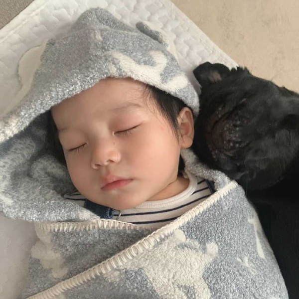 ほっこりする犬のデザインとくすみブルーがおしゃれなフード付きバスタオルは男の子の出産祝いにおすすめ!