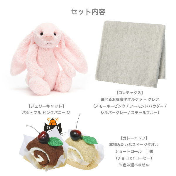 ふわふわの手触りが魅力のジェリーキャットと、お昼寝にぴったりの今治タオルケット、さらに可愛いスイーツタオルがセットになった、ベベリー限定のオリジナルギフトです。