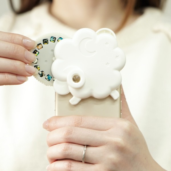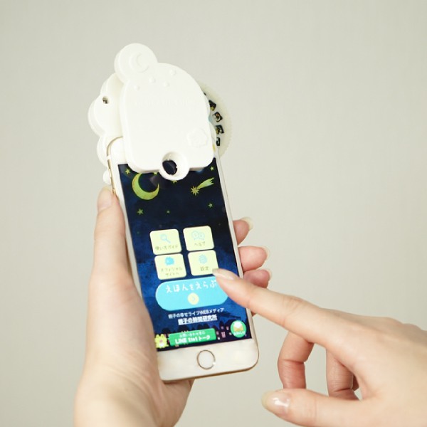 スマホのLEDライトを利用し、「プロジェクター」と「おはなしディスク」で、天井に絵本の世界を投影させる、絵本プロジェクターです。