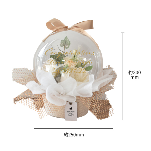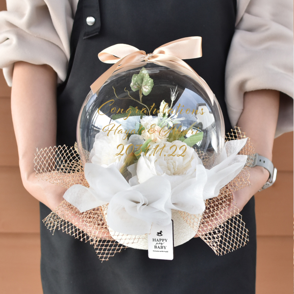 上品なアイボリーカラーのフラワーボックス。シンプルながら高級感のあるデザインで、結婚式の両親プレゼントや結婚祝いに最適です。リボン付きでそのまま贈れるので、手間いらずで華やかな印象を演出します。少しめずらしいバスケットに入ったバルーンは、ほっこりとしたフォルムでナチュラルな雰囲気。どんなお部屋にもなじむインテリアとしても楽しめます。