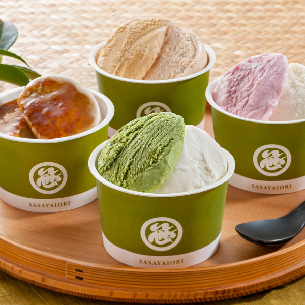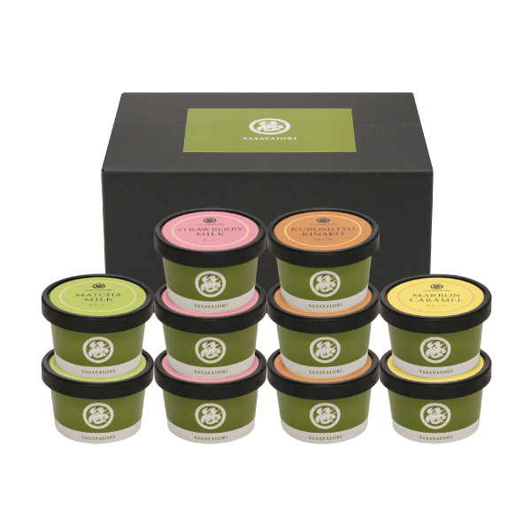 京都の移ろいゆく四季をイメージしたアイスです。苺を楽しむ春、緑が濃くなり抹茶の爽やかさが嬉しい夏、秋の味覚の代表格の栗、厳しい冬の寒さの中での暖かさをイメージしたとろりとした黒蜜。春夏秋冬をイメージしてお召し上がりください。老舗和菓子店、京菓匠笹屋伊織監修です。 -