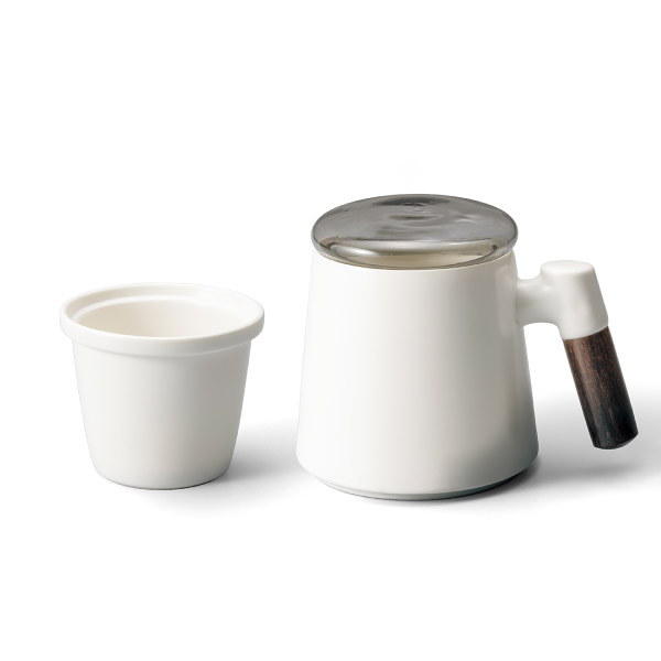 木目の美しい取っ手に、細かい梨地の磁器が重厚感を感じさせるマグカップ。スモーキーな色合いの耐熱ガラス製の蓋を合わせたティーストレーナー付きマグカップはティーポットがなくてもお茶が楽しめる機能性と、異素材が絶妙にミックスされた格好良さを併せ持っています。 -