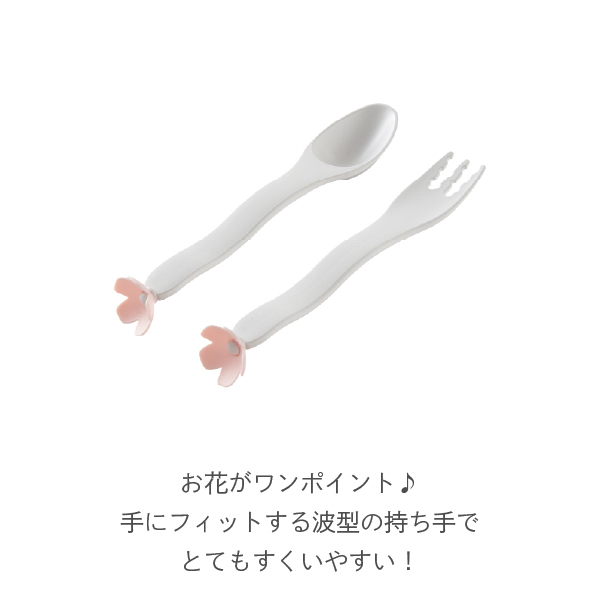 防水仕様でお洋服をしっかり守るエプロンと、カワイイおはなのモチーフが付いたスプーン&フォークのセットです。
