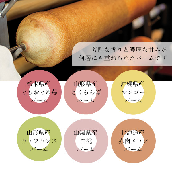 内容 アップルジュース180ml×1、ミカンジュース180ml×1、栃木県産 とちおとめ苺バーム×1、山形県産 さくらんぼバーム×1、山梨県産 白桃バーム×1、北海道産 赤肉メロンバーム×1、沖縄県産 マンゴーバーム×1、山形県産 ラ・フランスバーム×1 箱サイズ 381×185×65mm 賞味期限 4ヶ月 アレルギー 小麦・卵・乳成分・大豆・もも・りんご お届けについて