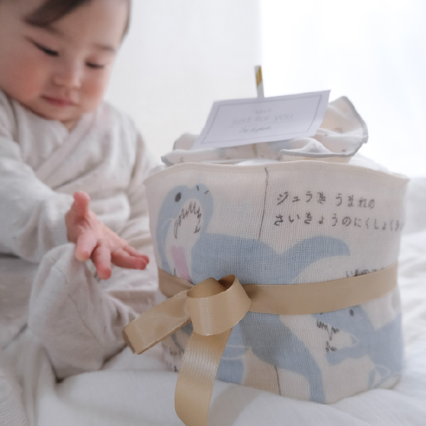 子どもたちに大人気!「きょうりゅうのひみつ」が楽しく学べる絵本タオルを使った、おしゃれで遊び心あふれるおむつケーキです。