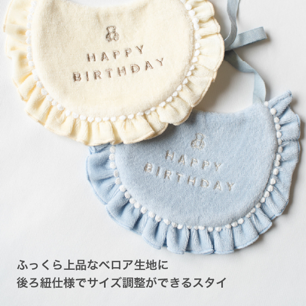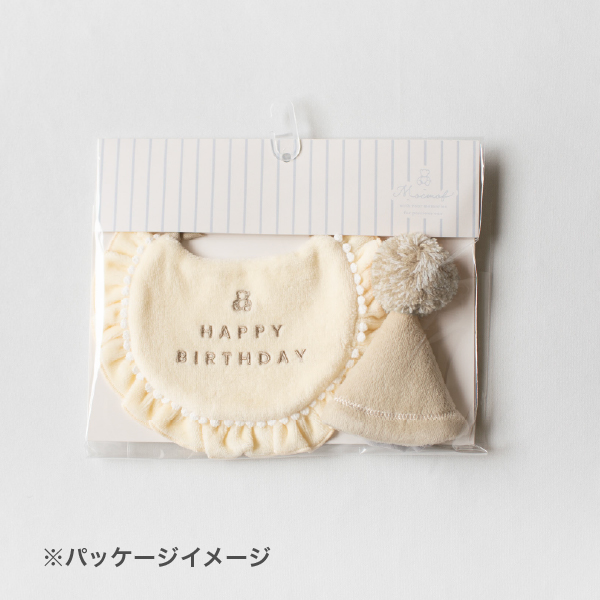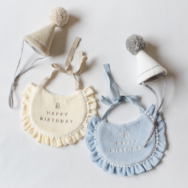 やさしいサックスカラーにフリルデザインをあしらった、ナチュラルで可愛らしいバースデーギフトセット。スタイととんがり帽子がセットになっており、これ一つで主役コーデが完成します。