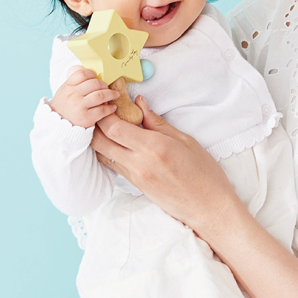 木の音色と色あいがやさしい、お星さまのラトルです。