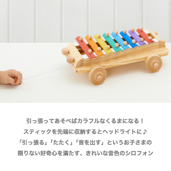 「引っ張る」「たたく」「音を出す」というお子様の限りない好奇心を満たす、きれいな音色のシロフォンです。 -