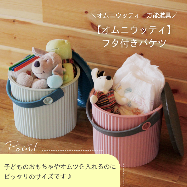 フタ付きの万能バケツ「オムニウッティ」。オムニウッティはお子さまのおもちゃ収納や、簡易スツールとしての使用はもちろん、密閉性か高いのでおむつ用ゴミ箱にもピッタリとSNSで話題に!ハンドル付で持ち運びも軽々できるので、アウトドアや、キャンプにも大活躍!