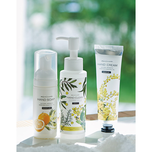 天然香料ミモザがふんわり香る、ハンドケア3点セット。しっとり潤うハンドクリーム、クリーミー泡のハンドソープ、軽い使い心地のクリーンジェルで、手肌をやさしくケア。癒しの香りで贈り物にも最適です。