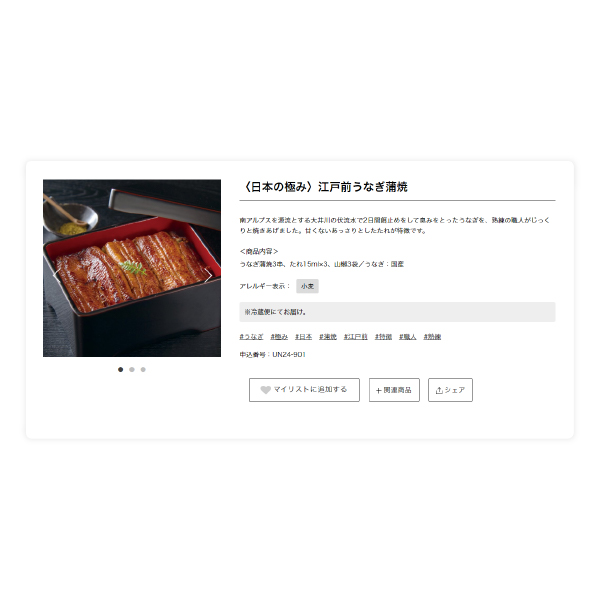 愛知県産のうなぎ割烹 一愼からは、うなぎの骨から旨みを引き出した特製たれ使用の「うなぎ蒲焼」と、うなぎ魚醤を使用して焼きあげた「うなぎ魚醤焼き」のセットをご用意。さらに、温暖な気候に恵まれた静岡県でこだわりを持ち育てられたうなぎを丁寧にさばき焼きあげた、静岡県産うなぎ蒲焼 静生旅鰻(せいしょうロマン)などもご用意。