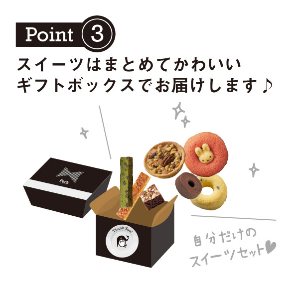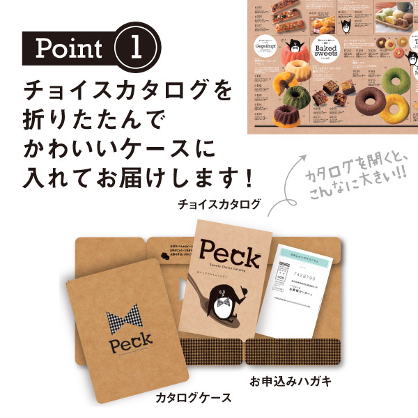 チョイスカタログの中から「好きなモノ、食べてみたいモノ」を自由にチョイスして自分だけのスイーツセットを作れたら。そんな視点で生まれた新しいギフトのカタチ、それが「PECK」です。注意事項