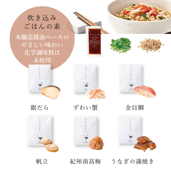 6種の炊き込みご飯が楽しめる、美しい風呂敷に包まれた炊き込みご飯の素セットです。「銀だら」「ずわい蟹」「紀州南高梅」「金目鯛」「帆立」「うなぎの蒲焼き」の詰め合わせ。ゴロっと食べ応えのある具材に三つ葉と白煎りごまがアクセントになり、より一層炊き込みご飯の美味しさを引き立てます。化学調味料を使用せず本醸造醤油をベースに、国産鶏、日高産昆布、焼津産鰹エキスで、風味豊かに仕上げたやさしい味わいが特徴です。