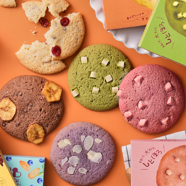 直径約8.5cm、しっとりほろほろ食感の大判クッキーのセット。チョコ生地にバナナ・宇治抹茶生地にホワイトチョコ・イチゴ生地にイチゴチョコ・プレーン生地にクランベリーとミルクチョコ・ブルーベリー生地にアーモンドスライス、異なるカラフルな5種類を詰め合わせました。その日の気分や好みで選ぶのも楽しいセットで自分へのご褒美やちょっとしたプレゼントにピッタリです。