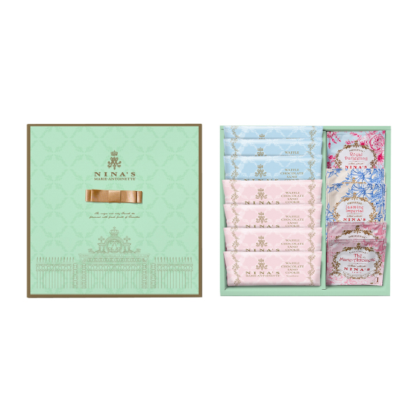 王妃マリー・アントワネットのラグジュアリー・ティーをイメージした、老舗フランス紅茶ブランド「ニナス」の紅茶と、チョコレートをサンドした香ばしいワッフルクッキーをセットでお届けします。 -