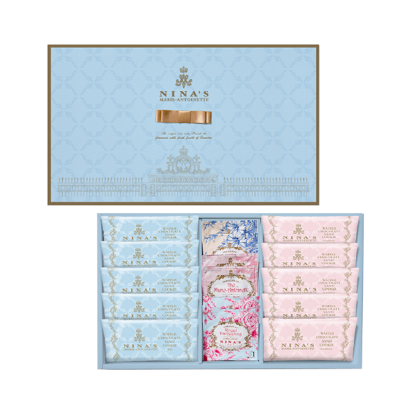 王妃マリー・アントワネットのラグジュアリー・ティーをイメージした、老舗フランス紅茶ブランド「ニナス」の紅茶と、チョコレートをサンドした香ばしいワッフルクッキーをセットでお届けします。 -