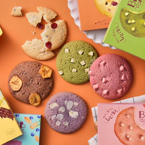 直径約8.5cm、しっとりほろほろ食感の大判クッキーのセット。チョコ生地にバナナ・宇治抹茶生地にホワイトチョコ・イチゴ生地にイチゴチョコ・プレーン生地にクランベリーとミルクチョコ・ブルーベリー生地にアーモンドスライス、異なるカラフルな5種類を詰め合わせました。その日の気分や好みで選ぶのも楽しいセットでちょっとしたプレゼントや手配り用にピッタリです。 -