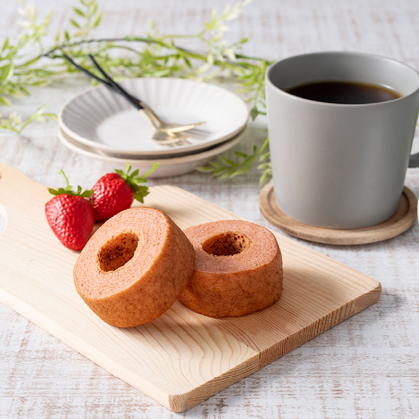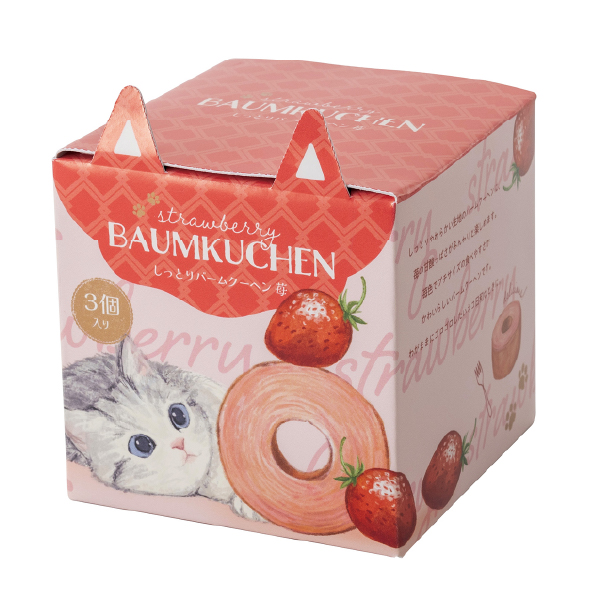 しっとりやわらかい生地のバームクーヘンに、苺の甘酸っぱさがふんわりと楽しめます。苺色でプチサイズの食べやすさが、かわいらしいバームクーヘンです。わがままにゴロゴロしたいネコ日和なときに。