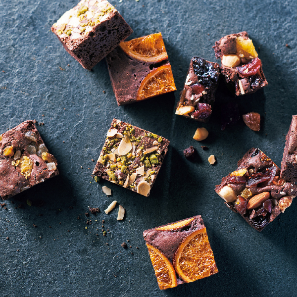 しっとり濃厚なチョコ生地に、ザクザク刻んだナッツの香ばしさと甘酸っぱいドライフルーツのマッチしたほどよい甘さがクセになります。フルーツとナッツのカラフルな色合いがとっても可愛い一品。フルーツのしっとり感とナッツのザクザク感がほどよいバランスです。