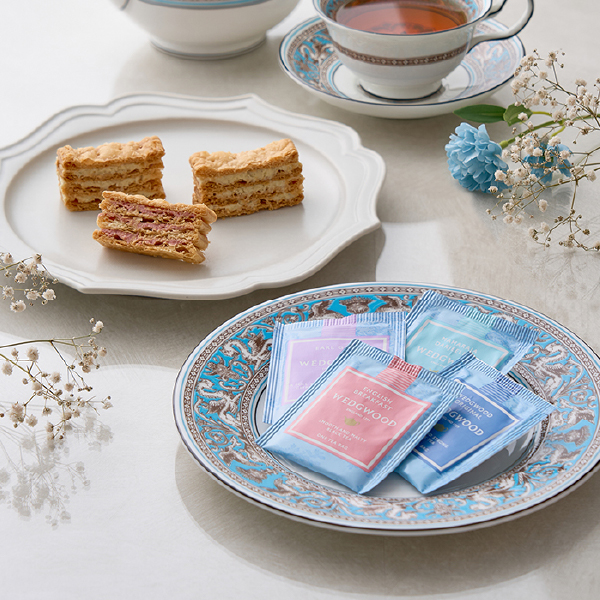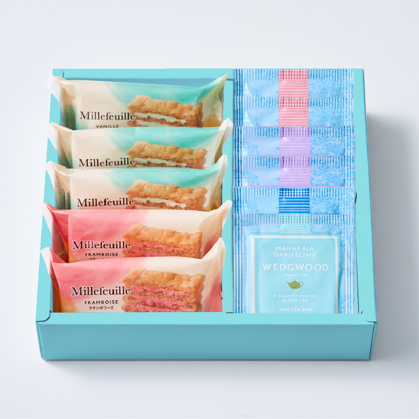 国産小麦100%のパイ生地に、バニラとフランボワーズの2種のクリームをサンドしたミルフイユと、ウェッジウッドの紅茶4種をセットにしました。サクサクのパイと風味豊かなクリーム、そして紅茶の芳醇な香りが口の中に広がる、贅沢なティータイムをお楽しみください。