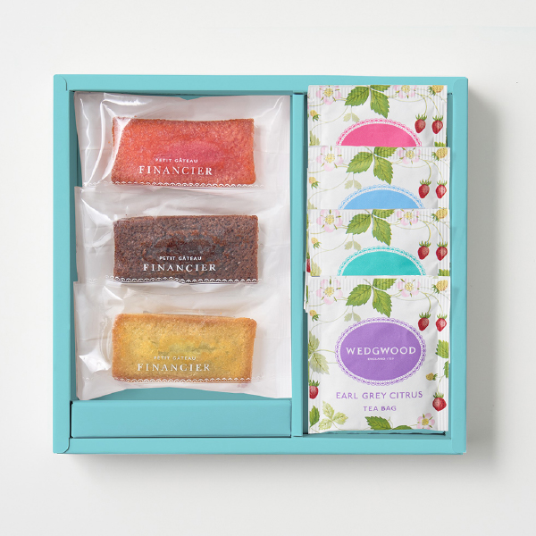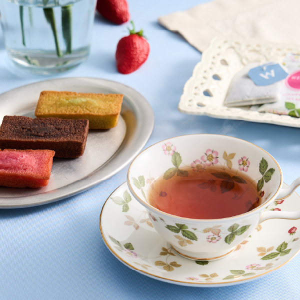 ストロベリー、ピスタチオ、チョコの3種類のフィナンシェと、ウェッジウッドの代表柄「ワイルドストロベリー」の可愛らしいパッケージの4種類のティーバッグをセットにしました。