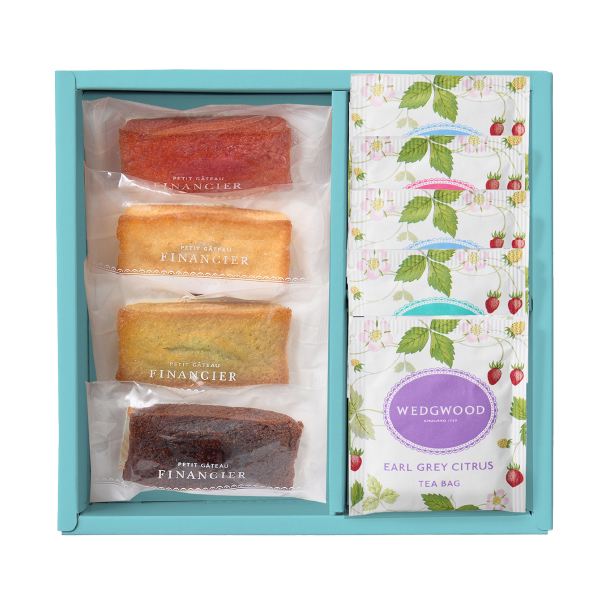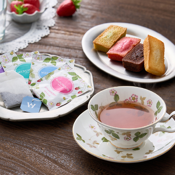 ストロベリー、プレーン、ピスタチオ、チョコの4種類のフィナンシェと、ウェッジウッドの代表柄「ワイルド ストロベリー」の可愛らしいパッケージの4種類のティーバッグをセットしました。