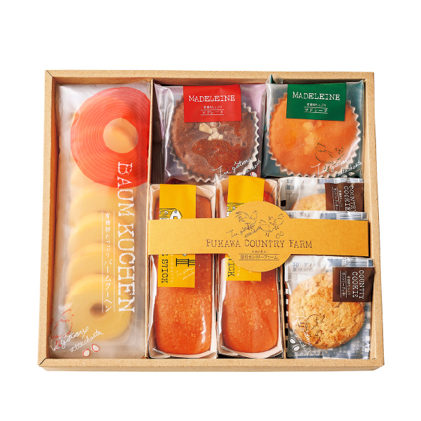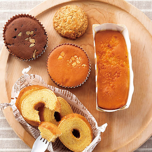 元気なたまごをたっぷりと。ちょっと贅沢なティータイム。有精卵をたっぷり使ったスイーツの詰合せ。ミニバームクーヘンや、二つの味のマドレーヌなどバラエティ豊富だから、みんなの集まりが華やぎます。