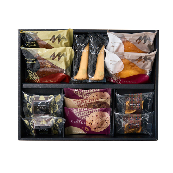 内容 ブラウニーネーブル・レーズンサンド・マドレーヌ(プレーン・チョコ)・チョコレートケーキ・レーズンクッキー×各2個、チョコチップクッキー×1個 箱サイズ 幅228×奥行313×高さ53mm 賞味期限 常温30日 アレルギー 卵、乳、小麦 お届けについて