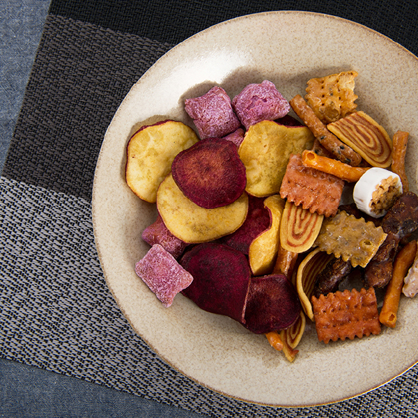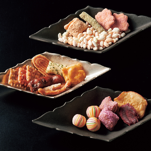 卵せんべいの生地にピーナツバターを練り込み、えんどう豆、そら豆、焙煎黒豆をトッピングした1袋で3種類の味が楽しめる商品です。