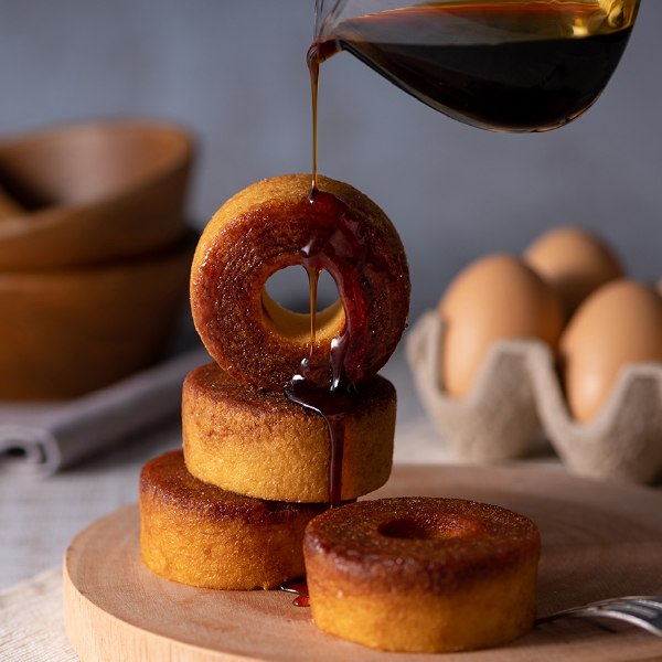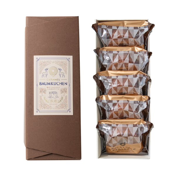 しっとりバームクーヘンにカラメルソースをまとわせ、砂糖をかけてさらに焼き上げました。ひと手間かけた贅沢なバームクーヘンです。プチサイズで食べやすく、しっかりとしたキャラメル風味が楽しめるアイテムです。