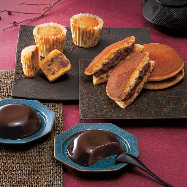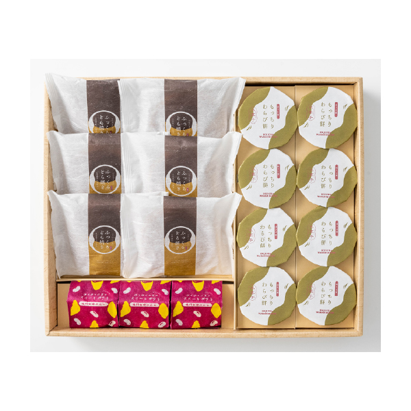 内容 ふっくらどら焼き×6個、もっちりわらび餅×8個、ほくほく小豆のスイートポテト×3個 箱サイズ 幅323×奥行395×高さ64mm 賞味期限 常温15日 アレルギー 卵、乳、小麦 お届けについて