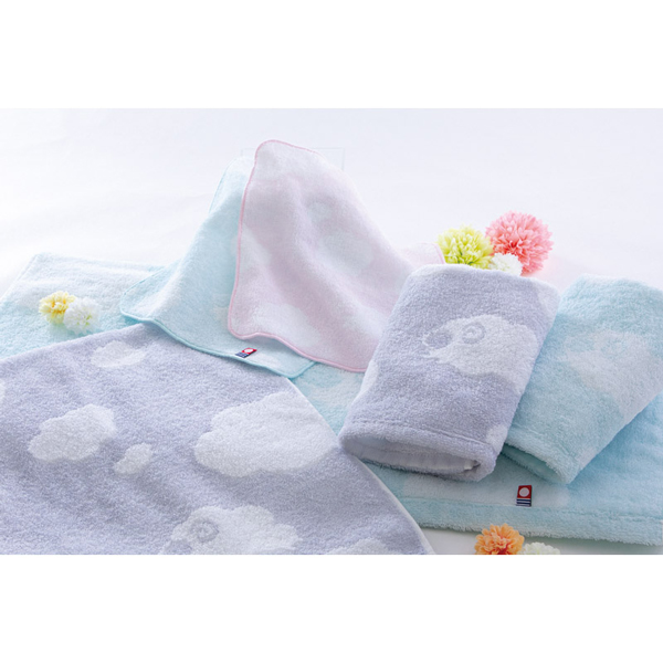 まるで雲のような、ふんわりとした柔らかさが特徴のタオル。糸の撚りをゆるく「甘撚り」した、通常の糸より柔らかい糸で織り上げています。かわいらしいひつじの柄とやさしい色合いはお子様のいるご家庭にもぴったり。