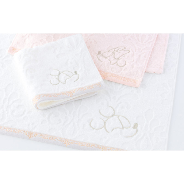 気品あふれるミッキーとミニーのアートを、煌めくラメ刺しゅうで上品に表現。エレガントな模様が全体を華やかに彩り、特別感のあるデザインに仕上げました。大切な方への贈り物にふさわしいタオルギフトです。
