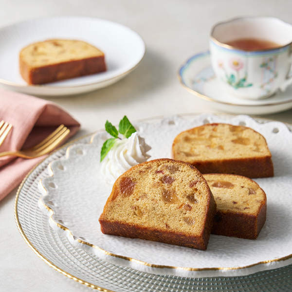 7種類のフルーツを洋酒に漬け込み、紅茶の生地でくるんだ、フルーツが詰まったパウンドケーキ。ひとくち食べ進めていくごとに、7種のフルーツそれぞれの味わいを楽しめる、ホテルシェフならではのデザートに仕上げました。