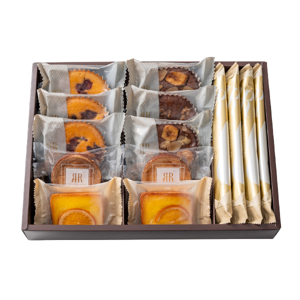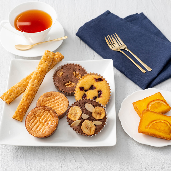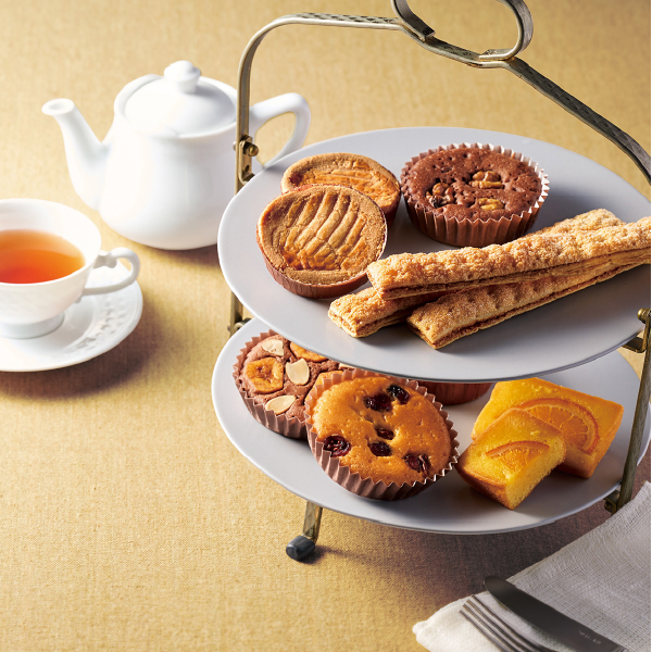 しっとり生地にフルーツやナッツを飾ったプチケーキやオレンジケーキ、さくっとした食感の中にキャラメルの風味が香る少し長いサイズのロングパイ、アーモンドが香ばしく香るフランス伝統の厚焼きクッキーと、ホテルの豊かなティータイムを演出するスイーツを詰め合わせました。 -